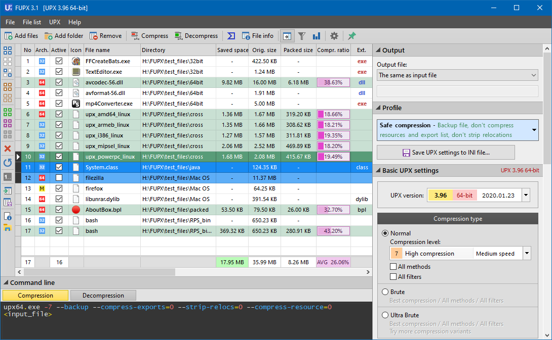 It allows you to compress (and decompress) files produced according to Microsoft Portable Executable Specification (EXE, DLL, OCX, BPL, CPL and other), ELF executables, Mac OS X executable files (Mach-O, Mach-FAT) and other. It offers easy access to all documented and undocumented UPX parameters without the need for command line usage.