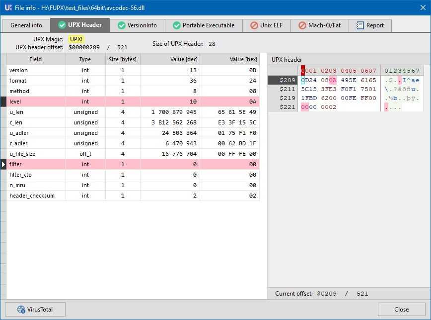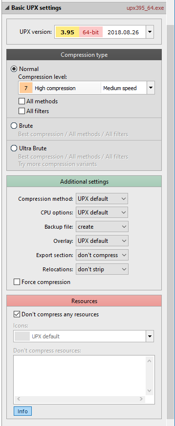 FUPX works with the last six versions of the UPX: 3.91, 3.92, 3.93, 3.94, 3.95, 3.96 and 4.0.0. The active UPX version can be set in the program options.