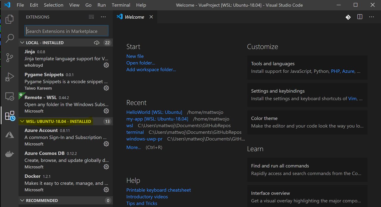 Python 확장과 같은 일부 확장 또는 Linting 또는 디버깅과 같은 작업을 처리하는 확장은 각 WSL 배포에 별도로 설치해야 합니다. VS Code는 WSL 배포판에 설치되지 않은 확장이 로컬에 설치된 경우 녹색 "WSL에 설치" 단추와 함께 경고 아이콘 ⚠을 표시합니다.