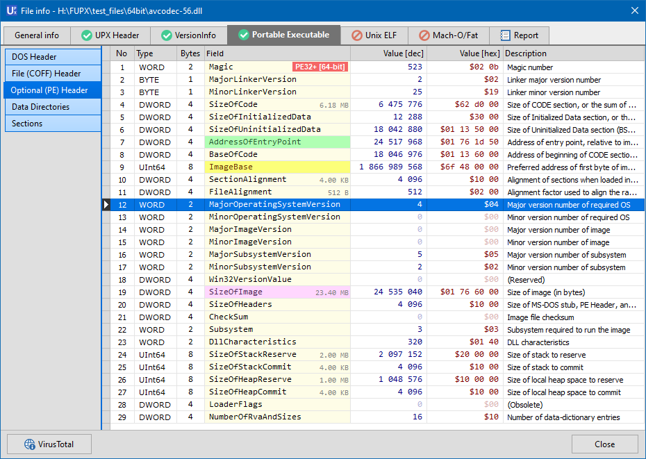 Current version supports 64-bit executable files (Win64/PE), but this feature is declared as experimental.