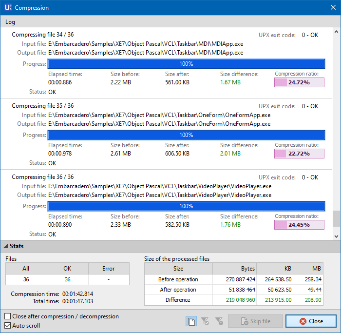 It allows you to compress (and decompress) files produced according to Microsoft Portable Executable Specification (EXE, DLL, OCX, BPL, CPL and other), ELF executables, Mac OS X executable files (Mach-O, Mach-FAT) and other. It offers easy access to all documented and undocumented UPX parameters without the need for command line usage.